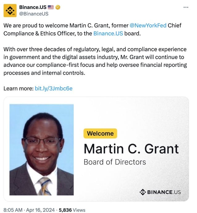 ในบล็อกโพสต์เมื่อวันที่ 16 เมษายน Binance US กล่าวว่าอดีตหัวหน้า Fed ของ NY Fed Martin Grant จะนำประสบการณ์ "ด้านกฎระเบียบ , กฎหมาย , และการปฏิบัติตามกฎระเบียบ" ของเขามาสู่เว็บเทรด crypto ในฐานะหนึ่งในสมาชิกคณะกรรมการใหม่ล่าสุด โดย Grant เป็นหัวหน้าเจ้าหน้าที่ฝ่ายปฏิบัติตามกฎระเบียบและจริยธรรมของ NY Fed ตั้งแต่ปี 2005 ถึง 2022 โดยร่วมงานกับธนาคารในปี 1990