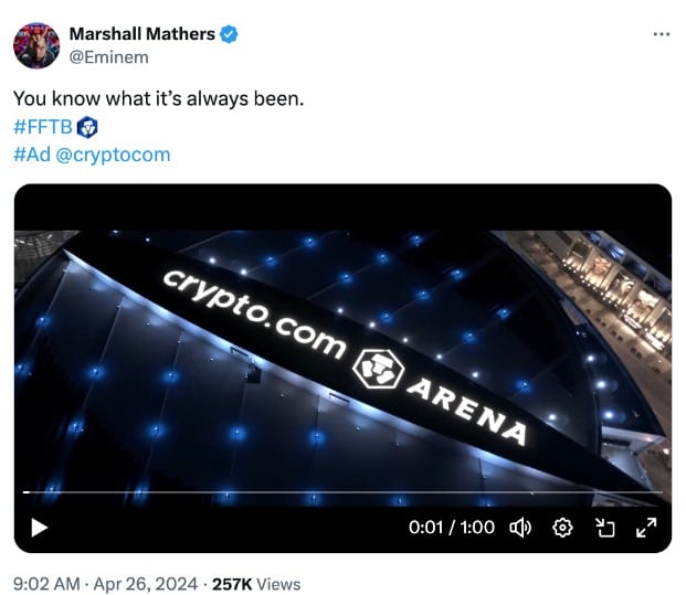 ในโพสต์ X เมื่อวันที่ 26 เมษายน Eminem ได้ปล่อยสปอตโฆษณาของ Crypto.com พร้อมระบุว่า "Fortune favors the brave," ซึ่งเป็นสโลแกนที่ Crypto.com เคยใช้ก่อนหน้านี้ ซึ่ง Eminem กลายเป็นหนึ่งในคนดังคนกลุ่มแรกที่โฆษณาเว็บเทรดสกุลเงินดิจิทัล นับตั้งแต่สปอตโฆษณาของนักแสดง Matt Damon ในเดือนตุลาคม 2021