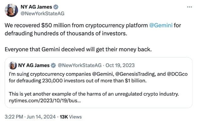 ในประกาศเมื่อวันที่ 14 มิถุนายน Letitia James อัยการสูงสุดแห่งนิวยอร์กกล่าวว่าเงิน 50 ล้านดอลลาร์ได้ยุติการฟ้องร้องระหว่างสำนักงานของเธอกับ Gemini ที่ยื่นฟ้องครั้งแรกในเดือนตุลาคม 2023 โดยคดีดังกล่าวกล่าวหาว่า Gemini ได้ฉ้อโกงนักลงทุน 230,000 ราย ซึ่งรวมถึงชาวนิวยอร์กด้วยผ่านโปรแกรม Earn