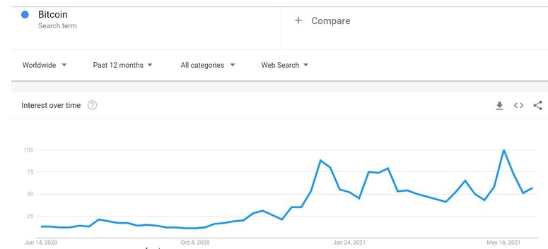 ในทางกลับกัน การค้นหา bitcoin ซึ่งทำสถิติสูงสุดใหม่ในช่วงกลางเดือนพฤษภาคม หลังการประกาศของ Tesla และ Elon Musk ก็เพิ่มขึ้นอย่างรวดเร็วในสัปดาห์ประวัติศาสตร์นี้ เพิ่มขึ้นเพียงเล็กน้อย