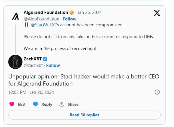 บัญชี X (หรือทวิตเตอร์) ของ Staci Warden ซีอีโอของ Algorand Foundation หลังจากผ่านไปเกือบหนึ่งวัน โดยมีการโพสเยาะเย้ยผู้ติดตามและแพลตฟอร์ม