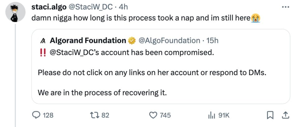 ทางด้าน Algorand ได้โพสต์ว่า "อยู่ในกระบวนการ" ในการกู้คืนบัญชีของ Warden โดยแฮ็กเกอร์ได้มีการโพสต์ข้อความที่มีการเหยียดเชื้อชาติและดูถูกต่าง ๆ