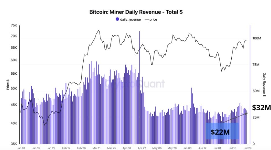 ในเดือนกรกฎาคม เงินไหลออกของนักขุดรายวันอยู่ระหว่าง 5,000 ถึง 10,000 ดอลลาร์ เมื่อเทียบกับ 10,000 ถึง 20,000 ดอลลาร์ เมื่อ BTC แตะระดับ 70,000 ดอลลาร์เป็นครั้งแรก ซึ่งนักขุดมีการขายออกก่อนที่จะถึง Bitcoin halving ที่จะทำให้รายได้ลดลง 50%