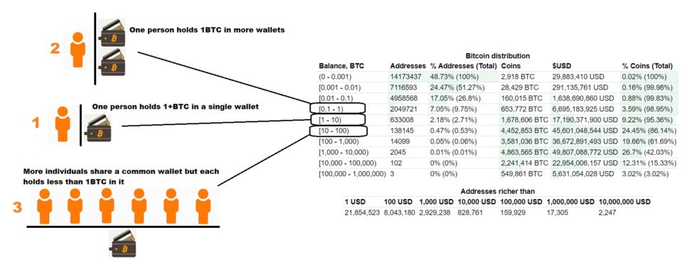 อย่างที่คุณเห็น ปัจจุบัน มีที่อยู่กระเป๋าทั้งหมด 633,008 ที่อยู่ที่มีอย่างน้อย 1 BTC (รวมทั้งสิ้น 1.68 ล้านเหรียญ) ซึ่งคิดเป็น 2.18% ของที่อยู่ทั้งหมด แต่อย่างไรก็ตามที่อยู่กระเป๋าหนึ่งแห่งไม่ได้หมายถึง 1 บุคคลแต่อย่างใด ทำให้ตัวเลขนี้ไม่ใช้ข้อมูลที่จะบอกจำนวนได้ 100%