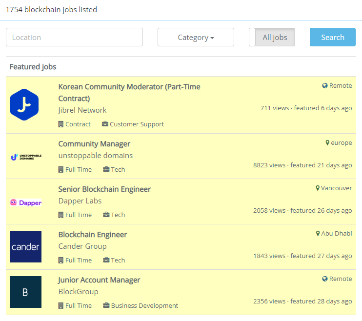 ที่เว็บไซต์นี้ก็เหมือนกับ Jobs4Bitcoin ที่งานไม่ได้จำกัดอยู่แค่ blockchain หรือ crypto โดยมีงานอีกมากมายตั้งแต่ ด้านการโฆษณาไปจนถึงเพลงและทุกสิ่งที่เกี่ยวข้อง