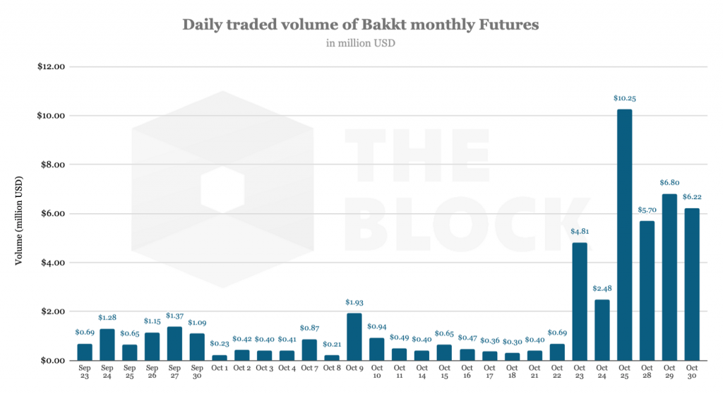 หลังจากที่เปิดตัวไปเมื่อเร็ว ๆ นี้ Bakkt ได้เห็นการเพิ่มขึ้นของปริมาณการซื้อขายของ bitcoin futures แบบรายเดือนที่ปรับตัวสูงขึ้นแตะระดับ 10.25 ล้านดอลลาร์ในวันที่ 25 ต.ค.