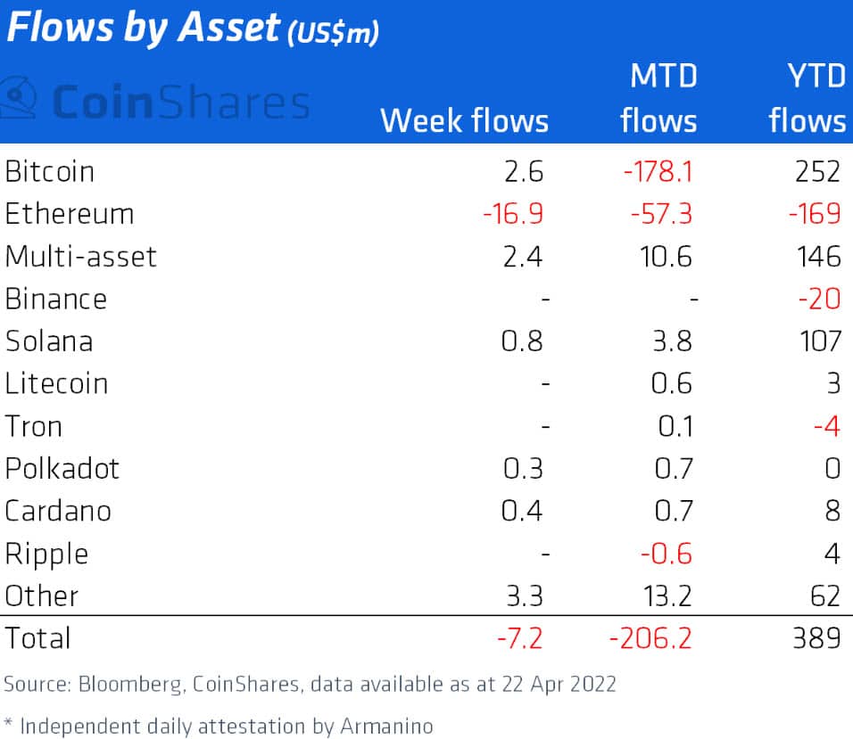 ข้อมูลจากรายงานกระแสกองทุนสินทรัพย์ดิจิทัลล่าสุดของ CoinShares แสดงให้เห็นว่า นักลงทุนเมื่อสัปดาห์ที่แล้ว (สิ้นสุดวันที่ 22 เมษายน) เข้าสู่ Avalanche ( AVAX ), Solana ( SOL ), Terra ( LUNA ) และ Algorand ( ALGO ) มูลค่า 3.5 ล้านดอลลาร์ในขณะที่พบว่ามีเงินทุนไหลออกจากผลิตภัณฑ์ Ether มีมูลค่ารวม 16.9 ล้านเหรียญสหรัฐเป็นสัปดาห์ที่สามติดต่อกัน