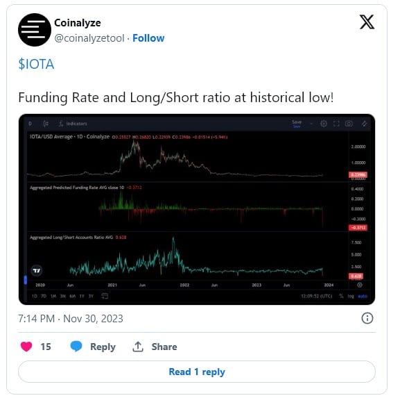 เมื่อวันที่ 30 พฤศจิกายน Coinalyze ผู้ให้บริการข้อมูลอนุพันธ์คริปโต ได้ทวีตกราฟ IOTA โดยสังเกตว่า “funding rate และ long/short ratio” ของ IOTA อยู่ที่ “ต่ำเป็นประวัติการณ์”