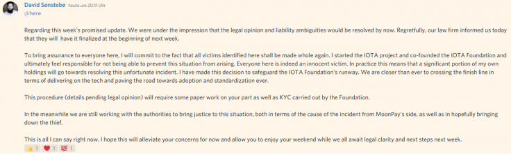 IOTA Foundation ได้เปิดตัว migration tool สำหรับผู้ใช้กระเป๋าเงินเพื่อช่วยให้ผู้ใช้รักษาเงินของพวกเขาให้ปลอดภัย อย่างไรก็ตาม David Sonstebo ผู้ก่อตั้ง IOTA ได้โพสใน Discord ว่าเนื่องจากการสอบสวนนั้นดำเนินไปช้าเกินไป เขาจึงจะขอชดใช้ให้แก่ผู้ที่ตกเป็นเหยื่อของการแฮ็กเอง โดย Sonstebo บอกว่าเขาจะใช้เงินของตัวเองในการชดเชยในครั้งนี้