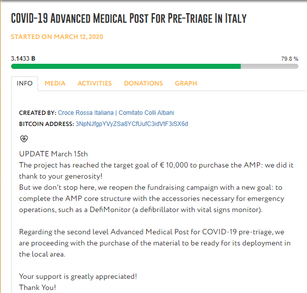 ย้อนไปเมื่อวันที่ 12 มีนาคม สภากาชาดของอิตาลีได้เปิดตัวแคมเปญระดมทุนด้วย BTC เพื่อซื้ออุปกรณ์ทางการแพทย์ระดับสูงสำหรับผู้ป่วย COVID-19 และเพียงสามวันต่อมา สภากาชาดก็ประกาศว่าได้รับเงินทุนครบตามเป้าหมายไปแล้วนั่นคือ $10,710 (10,000 ยูโร) และได้เริ่มนำเงินไปซื้อสิ่งของที่จำเป็นสำหรับผู้ป่วยเตรียมไว้ล่วงหน้า ซึ่งหลังจากบรรลุเป้าหมายแรกอย่างรวดเร็วสภากาชาดก็ยังคงเปิดระดมทุนด้วย Bitcoin ต่อไป