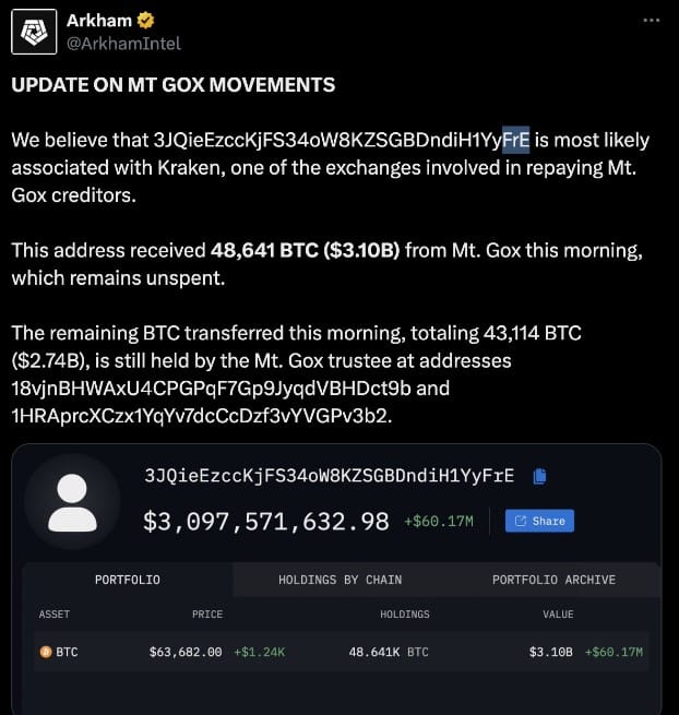 นอกจากนี้ Arkham Intelligence ยังได้รายงานการโอน Bitcoin จำนวน 48,641 Bitcoin มูลค่า 3.1 พันล้านดอลลาร์ จากกระเป๋าเงินของผู้ดูแล Mt. Gox เมื่อเช้าวันที่ 16 กรกฎาคม โดยแพลตฟอร์มวิเคราะห์เชื่อว่าเป็นกระเป๋าเงินที่เกี่ยวข้องกับ Kraken