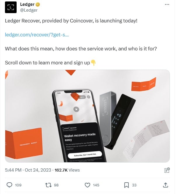 Ledger Recover บริการกู้คืน Private key ที่ใช้ ID สำหรับกระเป๋าเงินของ Ledger จะเปิดตัวในวันที่ 24 ตุลาคม ตามที่บริษัทประกาศอย่างเป็นทางการ บน X (ชื่อเดิม Twitter) ซึ่งการเปิดตัวดังกล่าวมาพร้อมกับการที่ Ledger ทำการสรุปโค้ดโอเพ่นซอร์สสำหรับ Ledger Recover บน GitHub