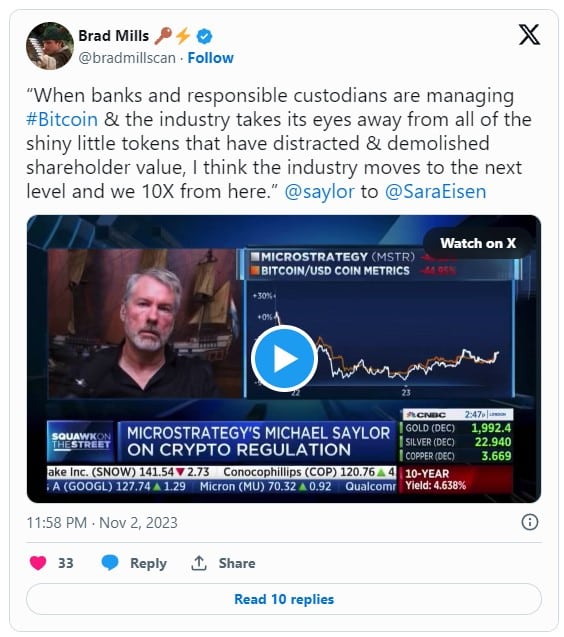 Saylor ยังเน้นย้ำถึงศักยภาพของ Bitcoin Spot ETF ที่จะดึงดูดนักลงทุนสถาบัน ซึ่งอาจผลักดันราคาของ Bitcoin ให้สูงขึ้นได้อย่างมาก