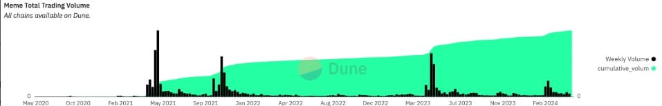 ข้อมูลจาก Dune เปิดเผยว่าธุรกรรม Memecoin ที่ไหลผ่านบล็อกเชนทั้งหมด รวมถึง Ethereum และ Solana ได้ลดลงโดยรวม 81% จากระดับสูงสุดล่าสุดประมาณ 998.55 ล้านดอลลาร์ในเดือนมีนาคม เหลือ 191.88 ล้านดอลลาร์ในสัปดาห์สิ้นสุดวันที่ 3 พฤษภาคม สิ่งนี้ชี้ให้เห็นว่านักเทรดสนใจหรือมั่นใจในภาคส่วนนี้ลดลงในช่วงหลังๆ นี้