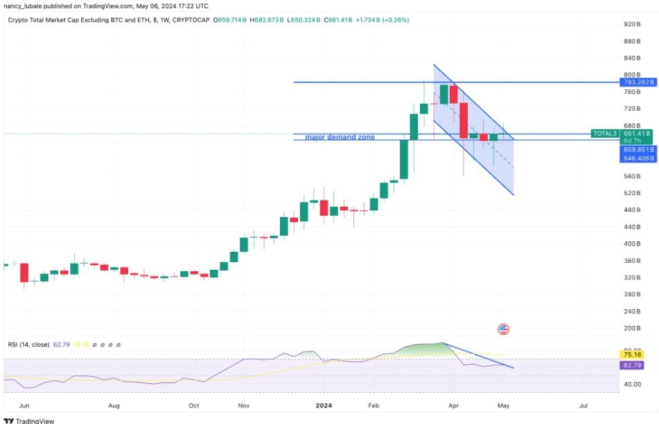 ภาพด้านล่างแสดงให้เห็นว่า TOTAL3 ลดลง 15% ตั้งแต่สัปดาห์แรกของเดือนเมษายน เหลือ 661.41 พันล้านดอลลาร์ นำไปสู่การปรากฏของ parallel channel จากมากไปหาน้อยในกราฟรายสัปดาห์ ดังที่แสดงด้านล่าง