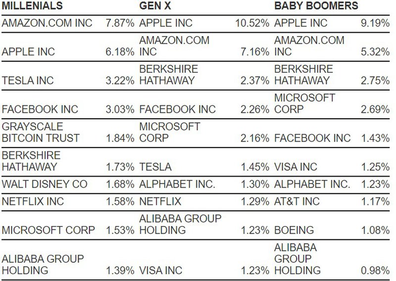 จากภาพด้านบนจะพบว่ากองทุน GBTC ของ Grayscale อยู่ในตัวเลือกอันดับที่ 4 ของกลุ่มคน GEN Y ที่ 1.84% โดยตามหลังเพียง Amazon 7.87%, Apple 6.18%, Tesla 3.22%, และ Facebook 3.03% เท่านั้น