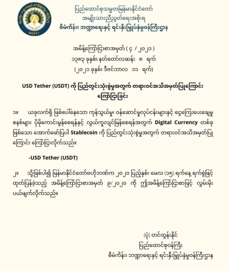 รัฐบาลเอกภาพแห่งชาติ (National Unity Government: NUG) หรือรัฐบาลเงาเมียนมา นำโดยผู้สนับสนุนนางอองซานซูจี ผู้นำที่ถูกคุมขัง ได้ประกาศให้เหรียญ Tether (USDT) ที่ผูกกับเงินดอลลาร์สหรัฐฯ เป็นสกุลเงินอย่างเป็นทางการสำหรับใช้ในท้องถิ่น