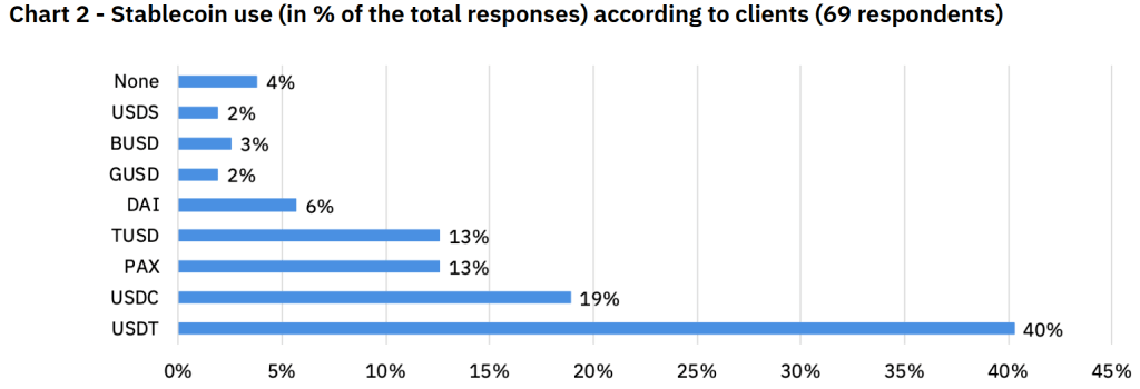 “USDT เป็น stablecoin ที่มีความโดดเด่นด้วยการใช้งานถึง 40.25% โดยมี USDC, TUSD, PAX เป็นอันดับรองลงมา