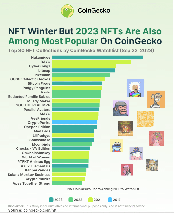NFT ที่สร้างขึ้นในปี 2021 ยังคงรักษาความน่าดึงดูดที่แข็งแกร่ง โดยครอง 12 อันดับจาก 30 อันดับแรกในการจัดอันดับความนิยมของ CoinGecko และพบว่า NFT ปี 2021 แสดงให้เห็นถึงความยืดหยุ่นในแง่ของชื่อเสียงและการสนับสนุนจากชุมชน