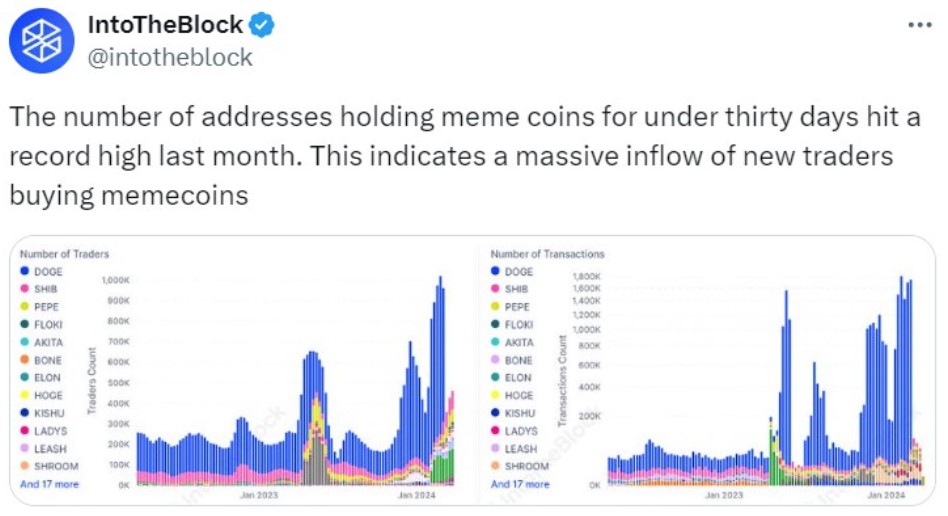 จำนวนนักเทรด Memecoin หน้าใหม่ พุ่งทำสถิติสูงสุด — IntoTheBlock รายงาน