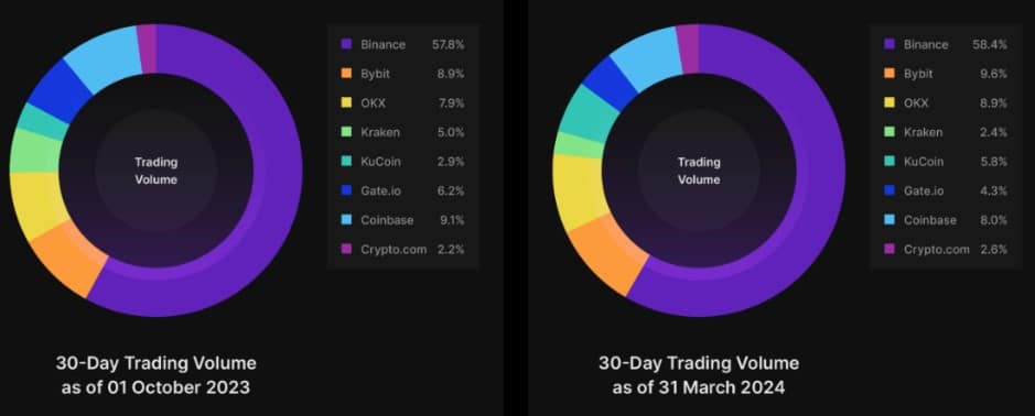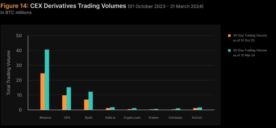 ตามข้อมูลจาก Bybit Institutional Report 2024 พบว่า CEX หลายแห่งมีปริมาณการซื้อขายรายเดือนเพิ่มอย่างน้อยสามเท่าตั้งแต่เดือนตุลาคม 2023 ถึงเดือนมีนาคม 2024