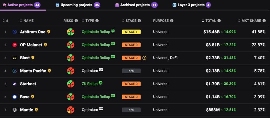 ตามข้อมูลจาก L2Beat ปัจจุบันมีเครือข่าย Ethereum เลเยอร์ 2 ที่ใช้งานอยู่ทั้งหมด 44 เครือข่าย ซึ่งมีมูลค่ารวมที่ถูกล็อค (TVL) อยู่ที่ 36.92 พันล้านดอลลาร์ โดยที่ Arbitrum (ARB) อยู่ในอันดับที่ 1 ของ TVL ที่ 14.5 พันล้านดอลลาร์