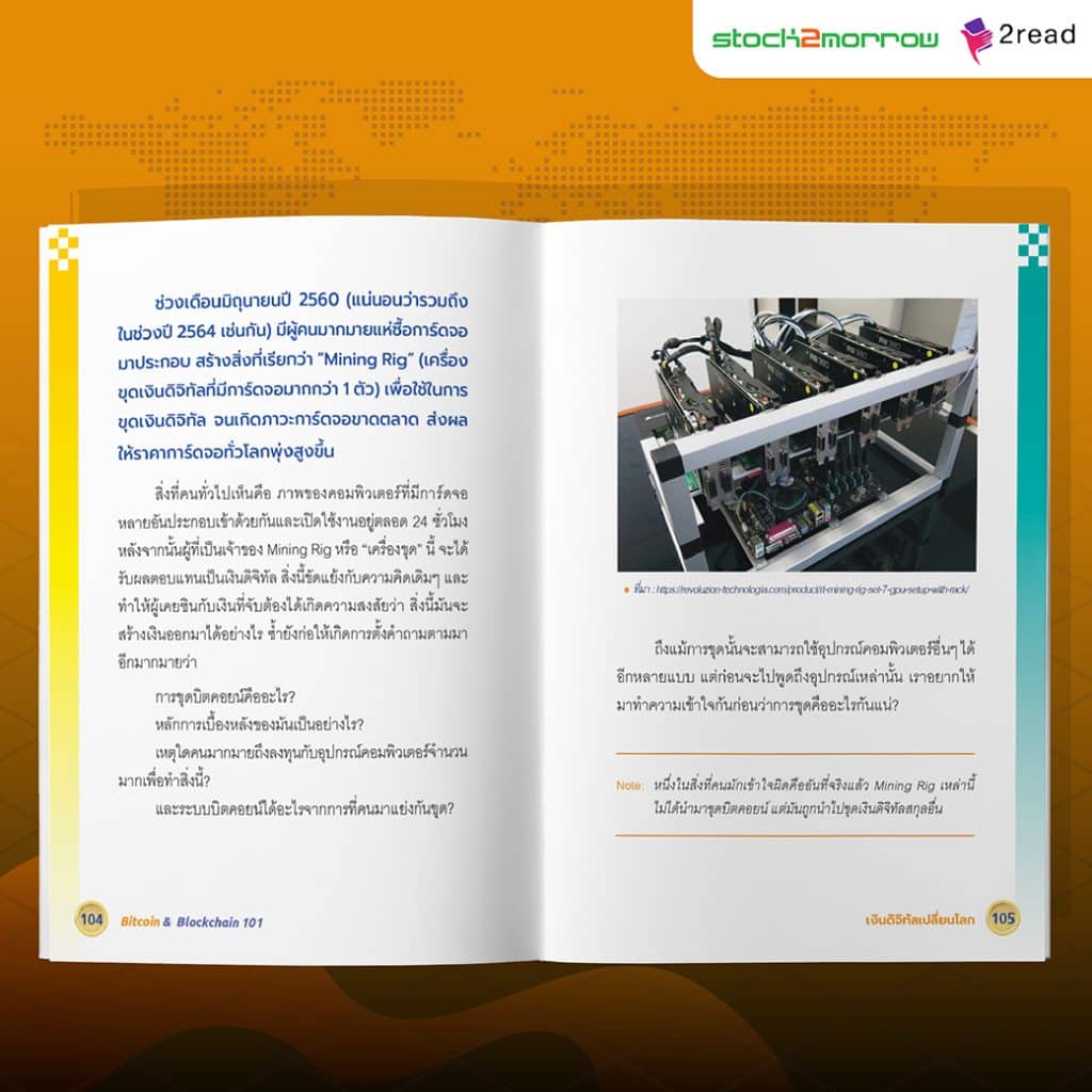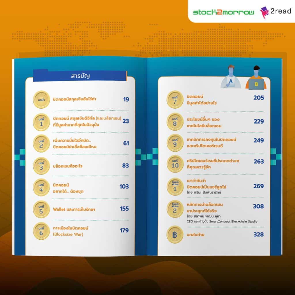 - บทที่ 2 เพิ่มความมั่นใจอีกนิด..บิตคอยน์น่าเชื่อถือแค่ไหน - บทที่ 3 บล็อกเชนคืออะไร - บทที่ 4 บิตคอยน์ อยากได้... ต้องขุด - บทที่ 5 Wallet และการเก็บรักษา - บทที่ 6 การเมืองในบิตคอยน์ (Blocksize War)