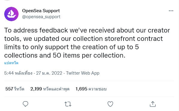 ซึ่งการประกาศที่ไม่คาดคิดจากบัญชี Twitter Support ของ OpenSea ที่โพสต์เมื่อวันที่ 27 มกราคม ระบุว่า “เรารู้ว่าการเปลี่ยนแปลงนี้อาจส่งผลกระทบต่อชุมชนของเรา ดังนั้นโปรดอย่าลังเลที่จะบอกเราว่าสิ่งนี้ส่งผลต่อกระแสความคิดสร้างสรรค์ของคุณอย่างไร”