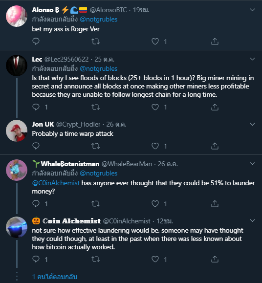 ด้านผู้คนในชุมชนคนอื่นๆต่างมาแสดงความเห็นกันมากมาย บางก็ว่าต้องเป็น Roger Ver แน่นอน บางคนก็ว่านักขุด Bitcoin ( BTC ) กำลังทดลองการโยกกำลังขุด BTC ไปที่ BCH