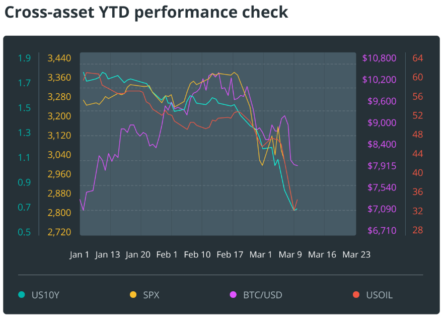 กุมภาพันธ์เป็นเดือนที่ยากลำบากสำหรับตลาดสกุลเงินดิจิตอล ด้วยความกลัวที่เพิ่มขึ้นจากการระบาดของโรค coronavirus ทำให้ราคา BTC ลดลงจากระดับ 10,400 ดอลลาร์ในช่วงกลางเดือนลงมาถึง 8,500 ดอลลาร์ในตอนท้ายของเดือน ในช่วงที่สภาพแวดล้อมมีความเสี่ยง เทรดเดอร์มักหลีกเลี่ยงการดำเนินการกับสินทรัพย์ที่มีความเสี่ยงเนื่องจากกลัวการสูญเสียเงินซึ่งรวมถึงตลาดหุ้นทั่วโลกด้วยเช่นกัน Dow Jones ลดลงหนักที่สุดในประวัติศาสตร์เมื่อวันที่ 9 มีนาคม โดยลดลงถึง 2,013.76 จุด โดยก่อนหน้านี้ลดลงเยอะที่สุดอยู่ที่ 1,190 จุดเมื่อวันที่ 27 กุมภาพันธ์ แม้กระทั่งค้าโภคภัณฑ์ก็ได้รับผลกระทบอย่างหนักเ่ชกัน โดยนํ้ามันดิบ West Texas Intermediate (WTI) ลดลงต่ำกว่า $50 ต่อบาร์เรล