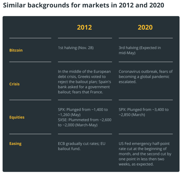 อย่างไรก็ตาม เมื่อมองย้อนเวลากลับไปนักลงทุนอาจพบว่าสภาวะตลาดในปัจจุบันมีลักษณะคล้ายกับปี 2012 ซึ่งเป็นปีที่มีการ halving ของ Bitcoin เช่นกัน และเกิดวิกฤตระดับโลกทั้งคู่ ดังนั้นจากประวัติศาสตร์ที่ผ่านมาจะช่วยบอกอะไรเราเกี่ยวกับก่อนและหลัง Halving ได้หรือไม่ในแง่มุมมองในเชิงเศรษฐกิจมหภาค