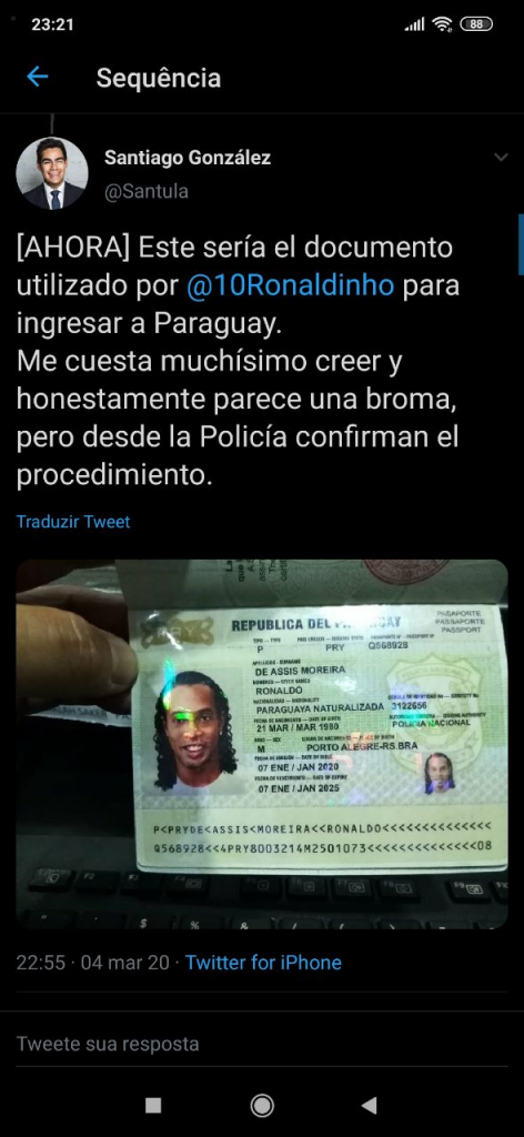 เมื่อวานนี้ โรนัลดินโญ่ โดนตำรวจจับพร้อมกับพี่ชายที่ประเทศปารากวัย หลังจากมีการใช้พาสปอร์ตปลอมเพื่อเดินทางเข้าประเทศ ซึ่งสาเหตุที่ โรนัลดินโญ่ เดินทางไปปารากวัยนั้นเพราะต้องไปร่วมงานการกุศล ตามคำเชิญของ เนลสัน เบล็อตติ เจ้าของคาสิโนแห่งหนึ่งในปารากวัย แต่สุดท้ายไม่ได้ไปร่วมงานดังกล่าวเพราะมาถูกจับเสียก่อน