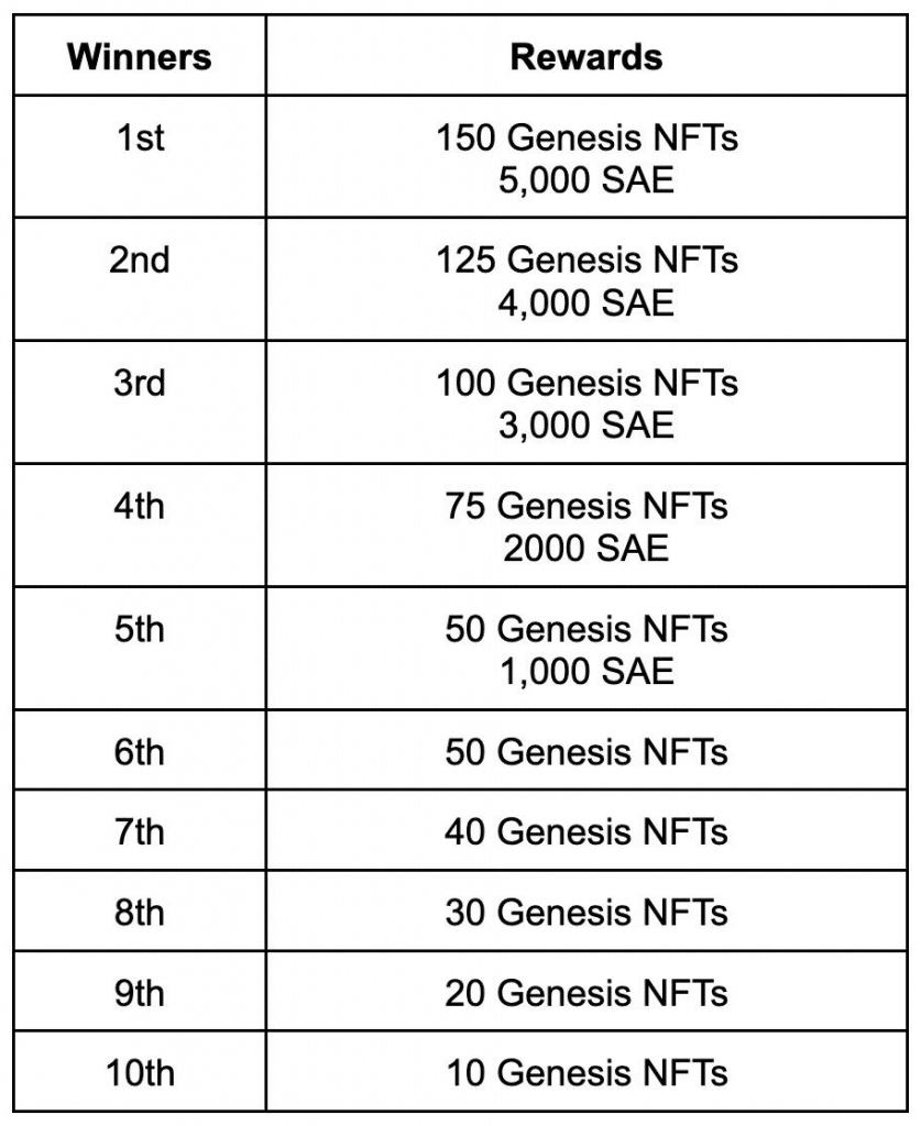 เงินรางวัลรวมทั้งหมด 15,000 SAE และ 725 Genesis NFT