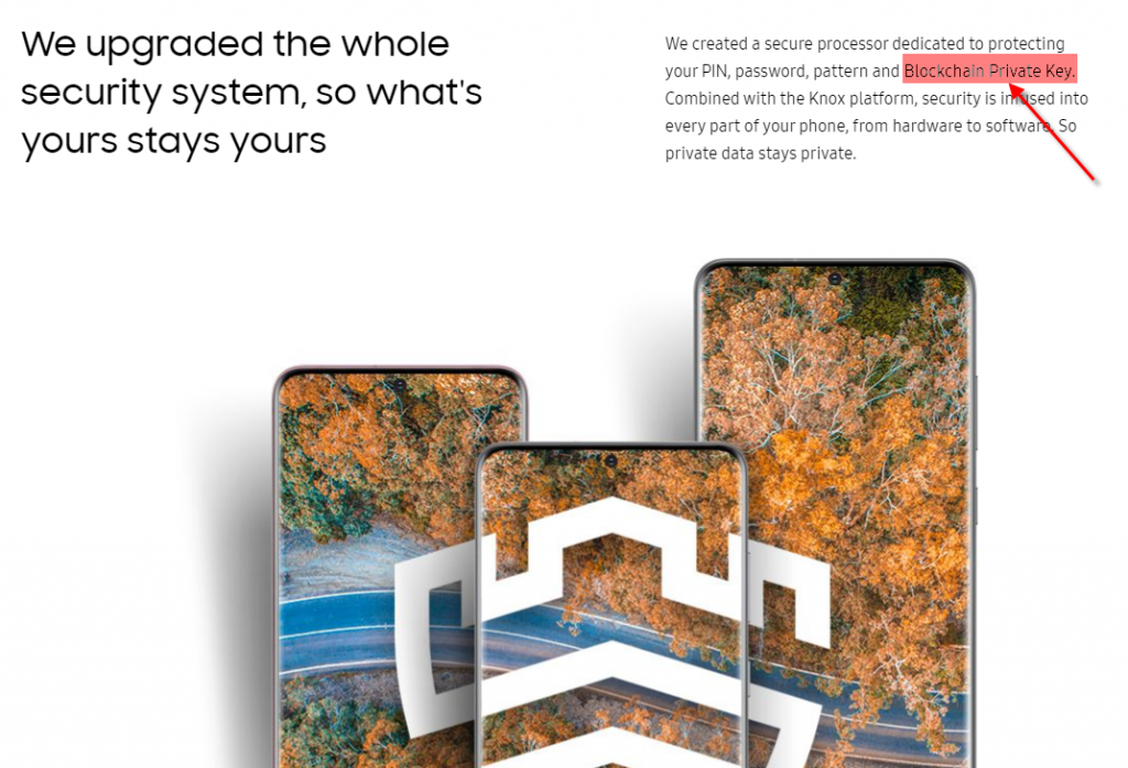 ที่หน้าเว็บไซต์อย่างเป็นทางการของ Samsung ระบุว่าโทรศัพท์ S20 มีโปรเซสเซอร์ที่ปลอดภัยที่ออกแบบท่โดยเฉพาะเพื่อปกป้อง PIN , password, และ Blockchain Private Key”