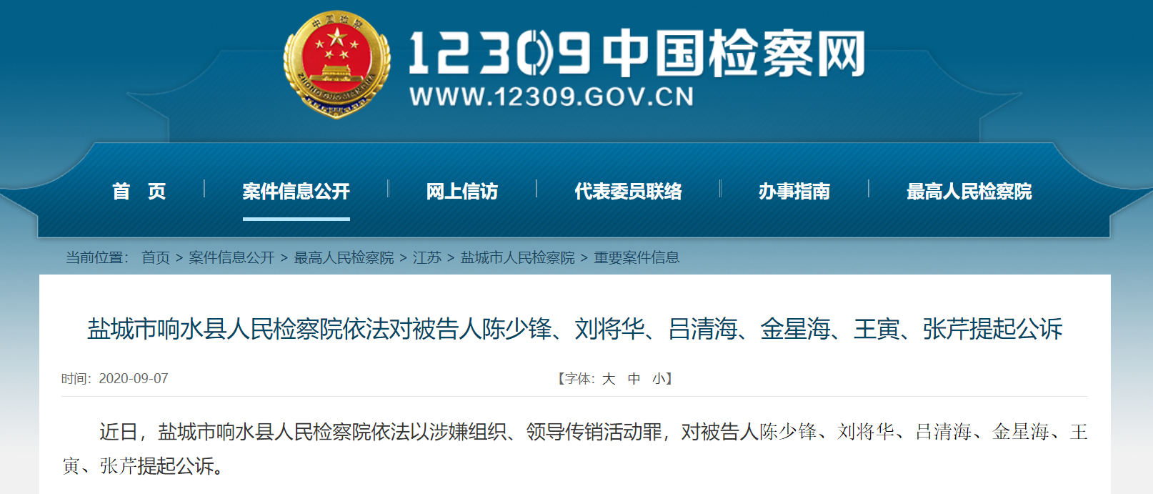 Chen Shaofeng, Luu Jianghua, Lu Jianghua, Lu Qinghai, Jin Xinghai, Wang Yin และ Zhang Qin ถูกอัยการใน Xiangshui County และเมือง Yancheng ตั้งข้อหาเมื่อวันที่ 7 กันยายน โดยเจ้าหน้าที่กล่าวว่าพวกเขา "ต้องสงสัยในการจัดตั้งและเป็นแม่ทีมของโครงการหลอกลวงนี้”