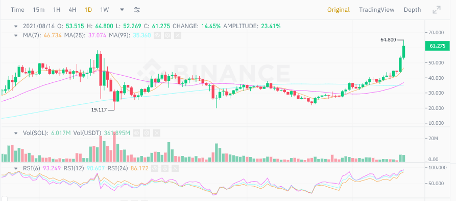 SOL—เหรียญของ โครงการ Solana blockchain— พุ่งทำสถิติสูงสุดใหม่ตลอดกาลที่ 64.90 ดอลลาร์ โดยมีการเติบโตกว่า 30 เปอร์เซ็นต์ใน 24 ชั่วโมงที่ผ่านมา