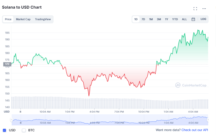 Solana (SOL) ได้พลิกแซง XRP สู่อันดับที่หกในส่วนของมูลค่า market cap ตามการจัดอันดับของเว็บไซต์ CoinMarketCap โดยปัจจุบันเหรียญมีราคาประมาณ $192 และมีมูลค่าตลาด 56 พันล้านดอลลาร์ หลังจากการพุ่งขึ้นของราคาที่น่าทึ่ง