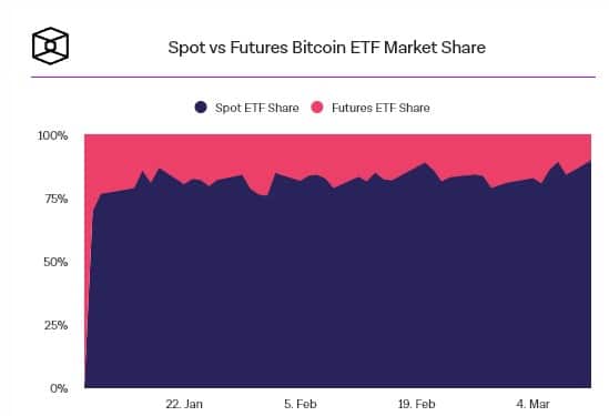 เพียงสองเดือนหลังจากการเปิดตัวกองทุน Spot bitcoin ETF ของสหรัฐฯ ก็ได้ขึ้นมาครองส่วนแบ่งตลาดปริมาณการซื้อขายรายวันเกือบ 90% ขณะที่ Bitcoin Futures ETF ที่เปิดตัวในปี 2021 ปัจจุบันมีโวลลุ่มรายวันเพียง 10% เท่านั้น