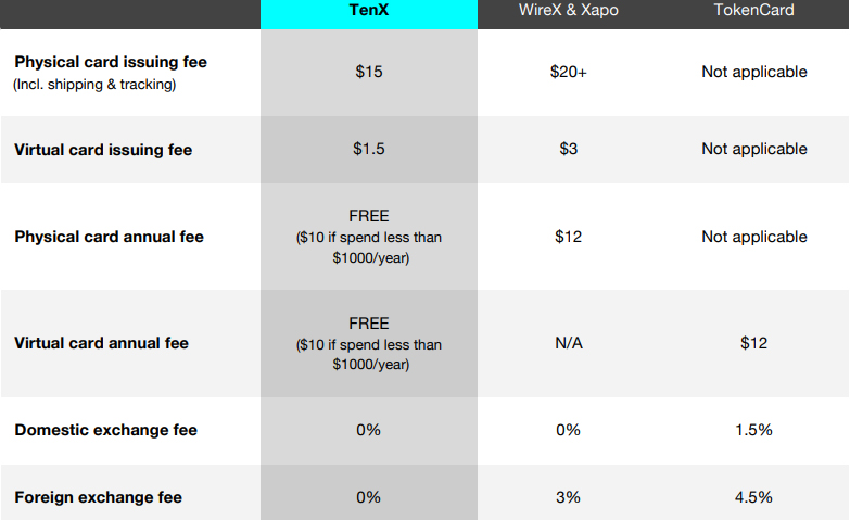 โครงสร้างนั้นถูกออกแบบมาว่าผู้ใช้จะจ่ายเงิน $1.50 เพื่อใช้บัตร TenX แบบดิจิทัล หรือ $15 เพื่อรับบัตรทางกายภาพ ไม่มีค่าธรรมเนียมรายปีสำหรับการใช้บัตรตราบใดที่คุณใช้จ่ายไม่เกินขั้นต่ำ $1,000 ต่อปี หากคุณไม่ผ่านเกณฑ์ขั้นต่ำนั้นบัตร TenX มีค่าธรรมเนียมรายปี $10