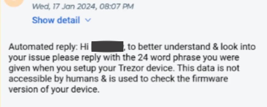 มีผู้ใช้อย่างน้อย 41 รายได้รับข้อความอีเมลโดยตรงจากผู้โจมตี เพื่อหลอกขอข้อมูลที่ละเอียดอ่อนเกี่ยวกับ recovery seeds