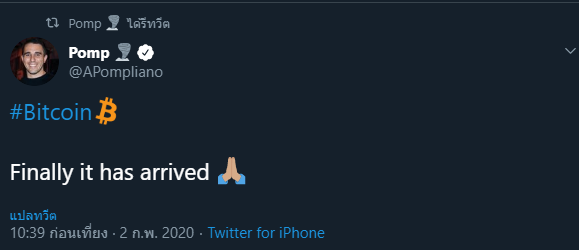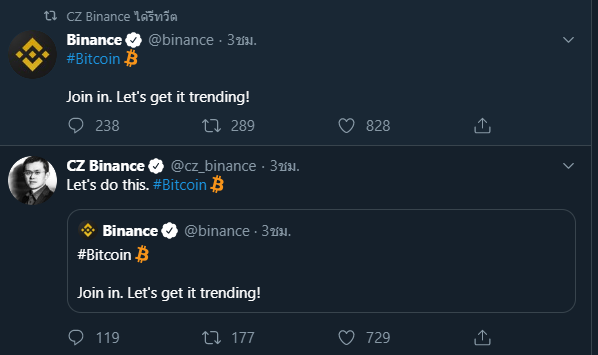 หลังจากนั้นก็มีผู้ที่มีชื่อเสียงในชุมชนคริปโตหลายคน ที่ได้ออกมาแสดงความยินดี และเรียกร้องให้เหล่าชุมชนคริปโต ช่วยกันปั่นให้ #bitcoin ติดเทรนด์ทวิตเตอร์ ไม่ว่าจะเป็น CZ ซีอีโอของ Binance หรือ Anthony Pompliano เจ้าของ Morgan Creek Digital