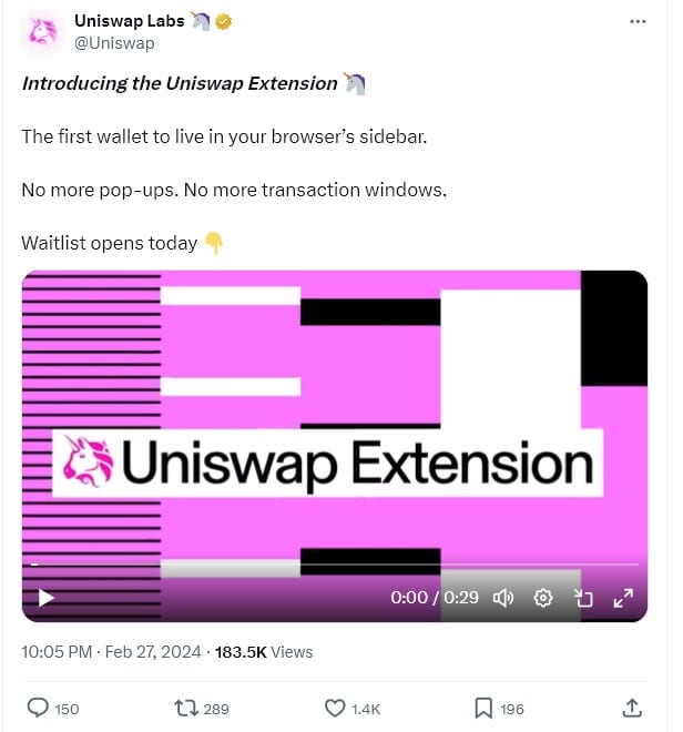“Uniswap Extension เป็นส่วนขยายกระเป๋าเงินตัวแรกที่จะอยู่ในแถบด้านข้างของเบราว์เซอร์ของคุณ ไม่ว่าคุณจะอยู่ที่ไหนบนเว็บก็ตาม” Uniswap Labs ประกาศเมื่อวันอังคาร