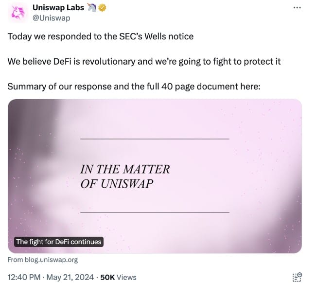 “SEC ไม่ควรทุ่มเททรัพยากรที่ได้รับทุนสนับสนุนจากผู้เสียภาษีเพื่อดำเนินคดีกับเรา” Uniswap กล่าว “แต่เราก็พร้อมที่จะต่อสู้”