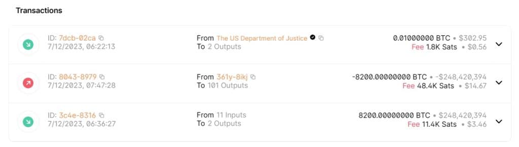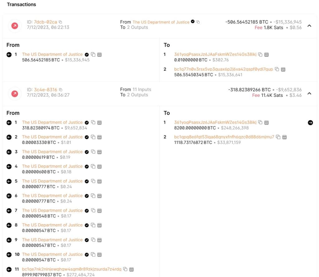 กระเป๋าเงิน cryptocurrency ที่เกี่ยวข้องกับกระทรวงยุติธรรมของสหรัฐอเมริกา (DOJ) ได้มีการย้าย Bitcoin ประมาณ 9,825.25 BTC จากการยึดมาจาก Silk Road มูลค่าประมาณ 299 ล้านดอลลาร์ในการทำธุรกรรมหลายรายการในวันที่ 12 กรกฎาคม