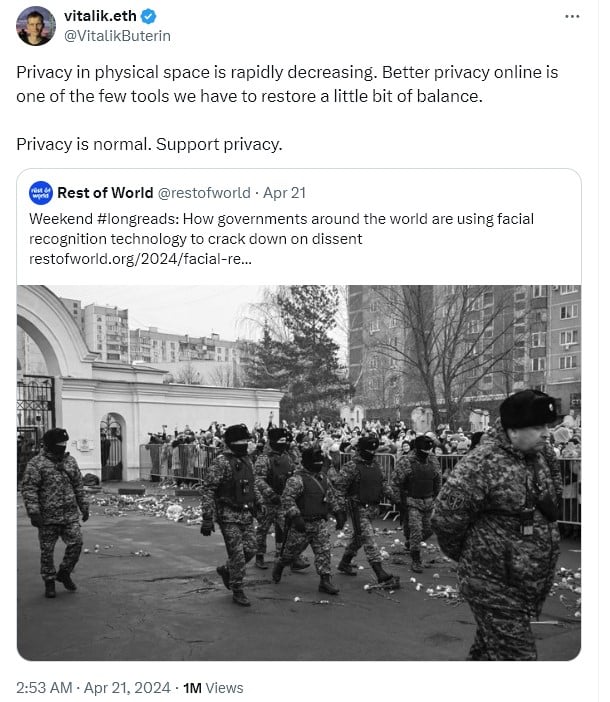Vitalik Buterin ผู้ร่วมก่อตั้ง Ethereum ได้ออกมาสนับสนุนในการปกป้องความเป็นส่วนตัวบนออนไลน์ หลังจากมีรายงานที่น่าตกใจเกี่ยวกับการใช้เทคโนโลยีจดจำใบหน้าของรัฐบาลทั่วโลก