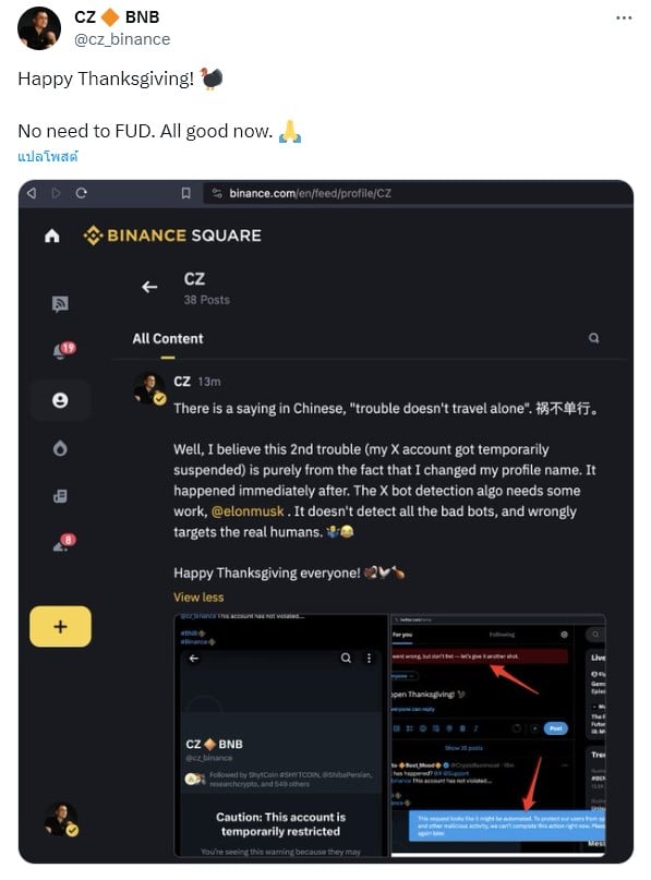X (เดิม Twitter) เผลอระงับบัญชี CZ ชั่วคราวก่อนจะกู้คืนให้ คาดเป็นความผิดพลาดจากบอท