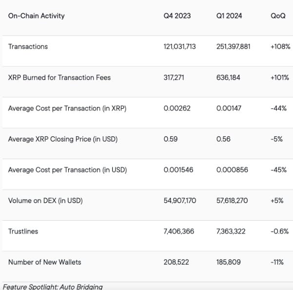 กิจกรรมการทำธุรกรรม on-chain ของ XRPL เพิ่มขึ้น 108% ในช่วงไตรมาสที่ 1 ปี 2024 โดยมีประมาณ 251.39 ล้านรายการ เทียบกับ 121.03 ล้านในไตรมาสที่ 4 ปี 2023 ตามรายงานที่เผยแพร่เมื่อวันที่ 17 พฤษภาคม