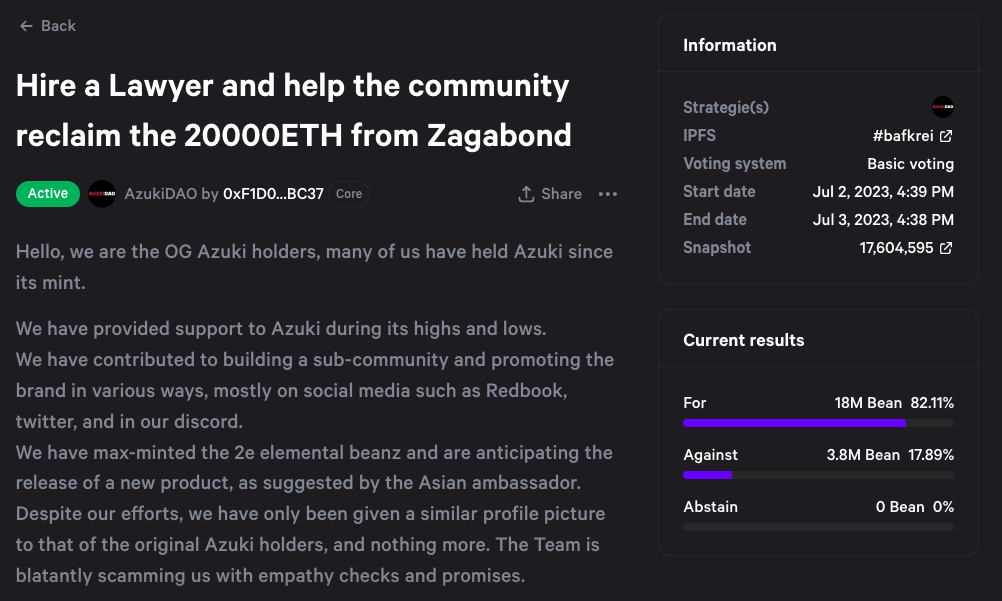 ข้อเสนอนี้ริเริ่มเมื่อวันที่ 2 กรกฎาคม โดยมีเนื้อหาเกี่ยวกับการว่าจ้างทนายความเพื่อดำเนินการทางกฎหมายกับ Zagabond หรือชื่อจริงว่า Alex Xu ที่ถูกกล่าวหาว่า “ขัดขวาง” หลายโครงการ Clawback แสวงหา ETH มูลค่า 39 ล้านดอลลาร์ที่ได้รับจากการเปิดตัวคอลเลกชัน “Elementals” ที่เป็นที่ถกเถียงกันของ Azuki มันเสนอที่จะจัดสรรเงินใด ๆ ที่ได้รับคืนให้กับ DAO เพื่อ "ส่งเสริมการเติบโตของชุมชน Azuki ทั้งหมด"
